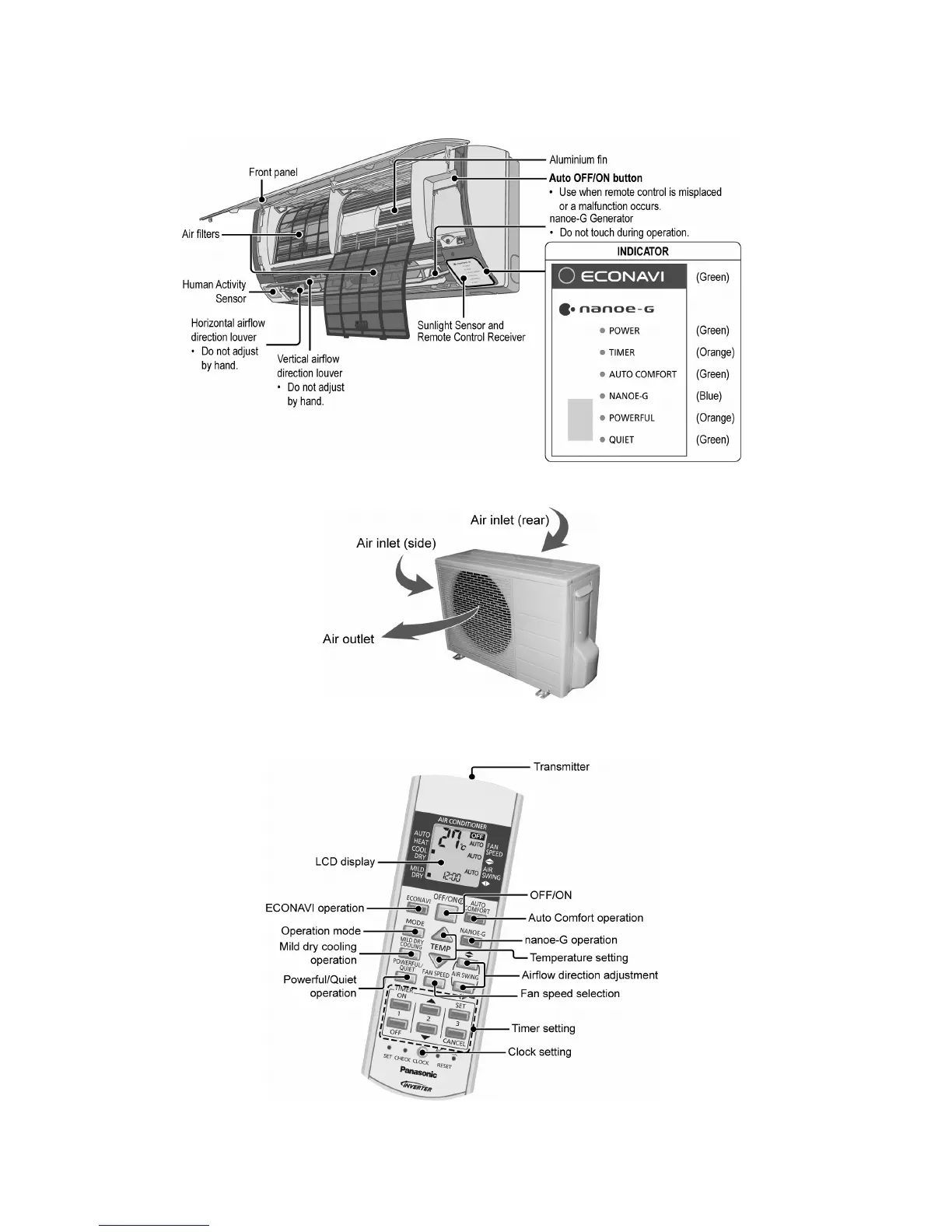 Panasonic CS-E18NKEW - 4 Location of Controls and Components; Indoor Unit; Outdoor Unit; Remote Control