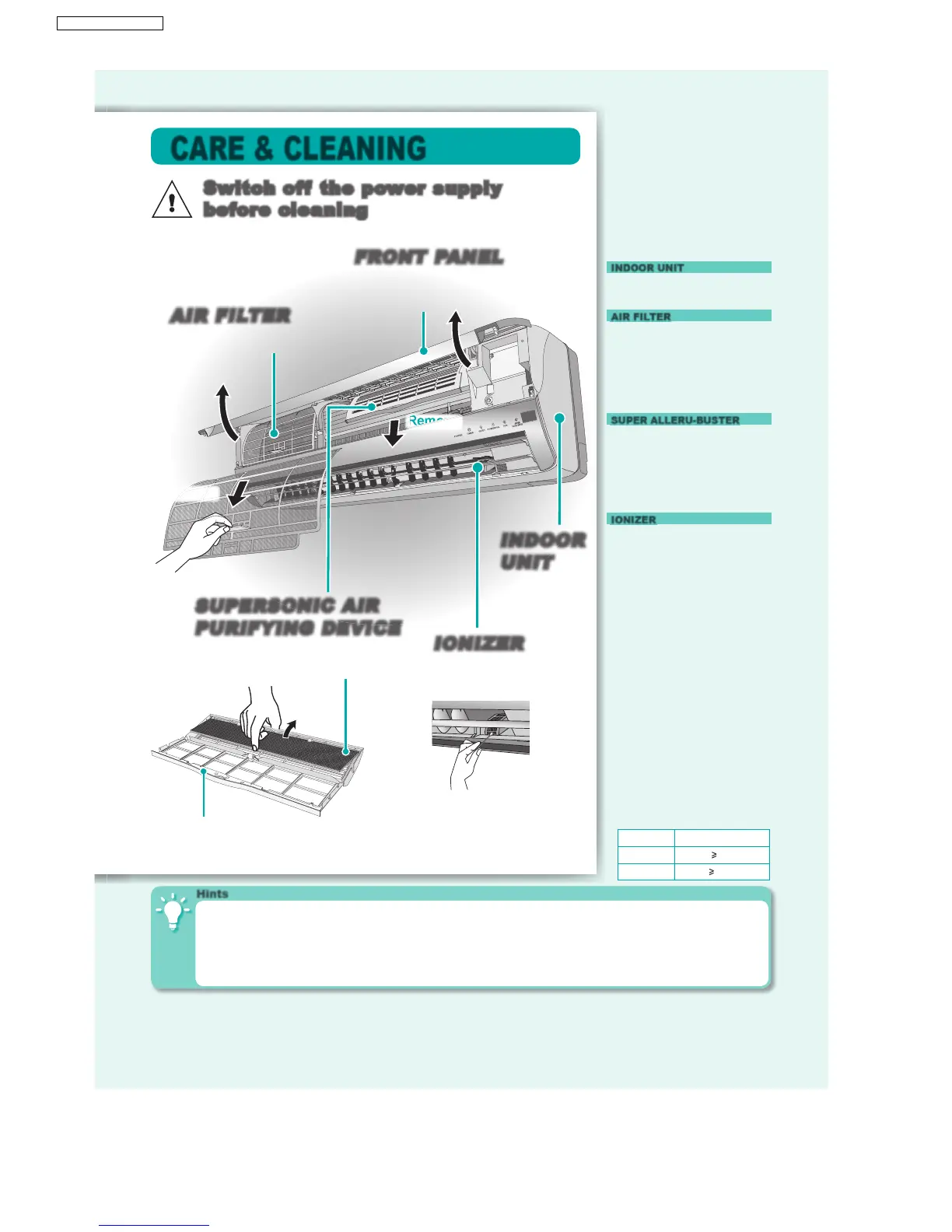 ● Clean the fi lter regularly as dirty fi lters will cause unpurifi ed air, low cooling or heating capacity, unpleasant smells and higher