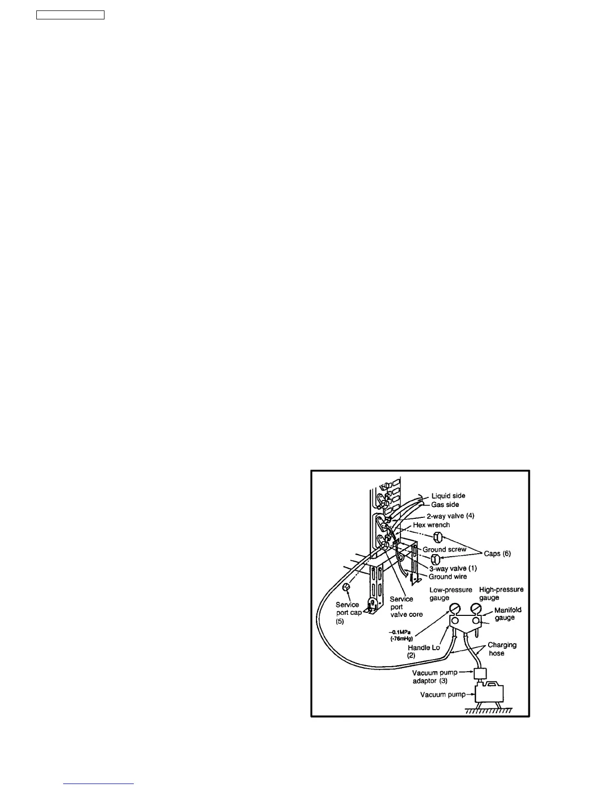 MPa (-76 cmHg). Once the vacuum process has finished, fully close the handle Lo of the manifold gauge and stop the