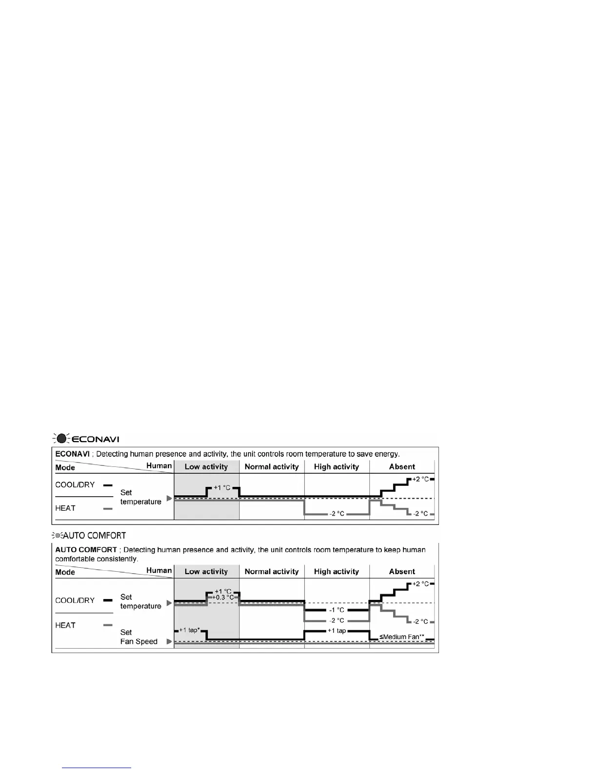 ** During human absence, maximum fan speed for COOL/DRY mode is medium fan.