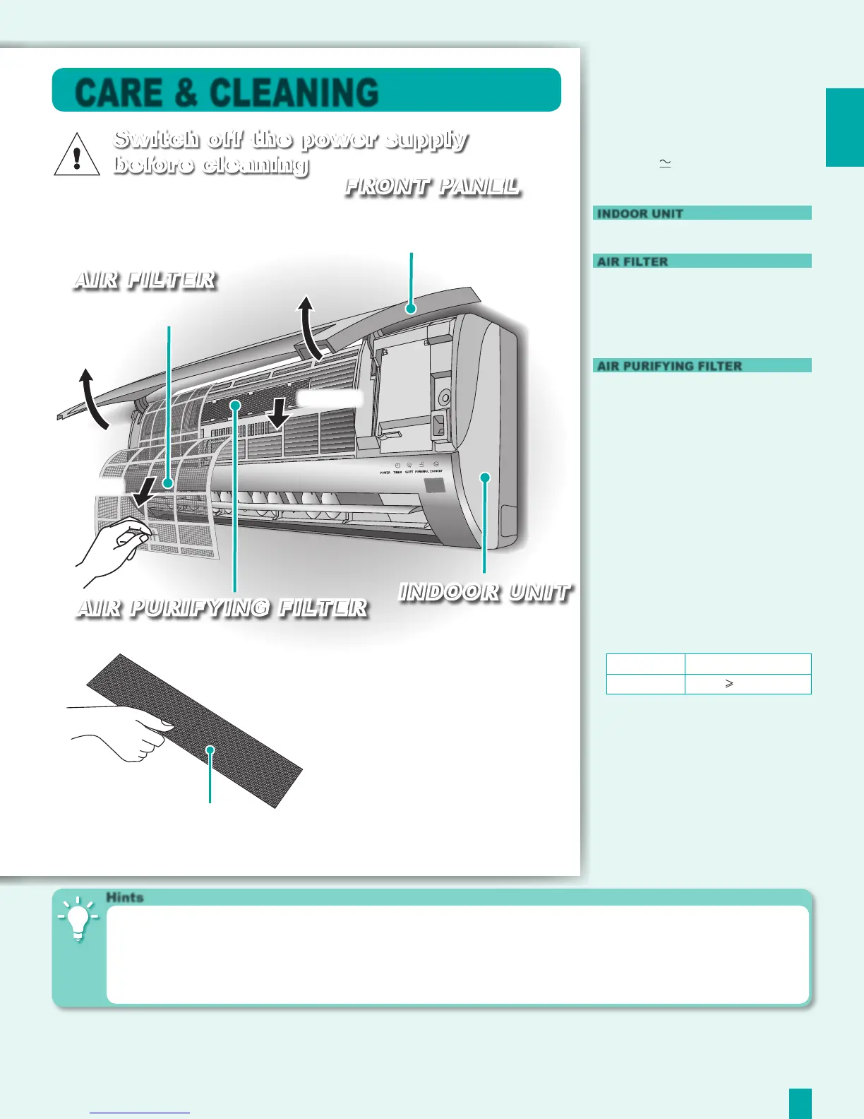 ● Clean the filter regularly as dirty filters will cause unpurified air, low cooling capacity, unpleasant smells and higher energy