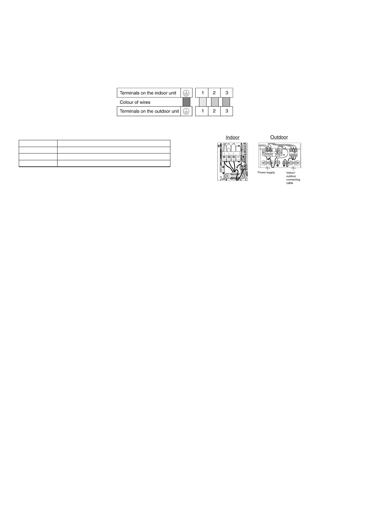 • Ensure the color of wires of outdoor unit and the terminal Nos. are the same to the indoor’s respectively.
