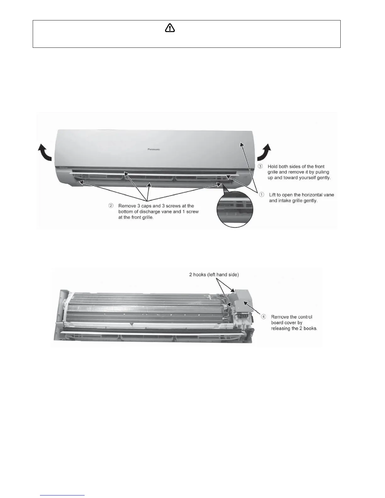 High Voltage is generated in the electrical parts area by the capacitor. Ensure that the capacitor has discharged sufficiently before proceeding with