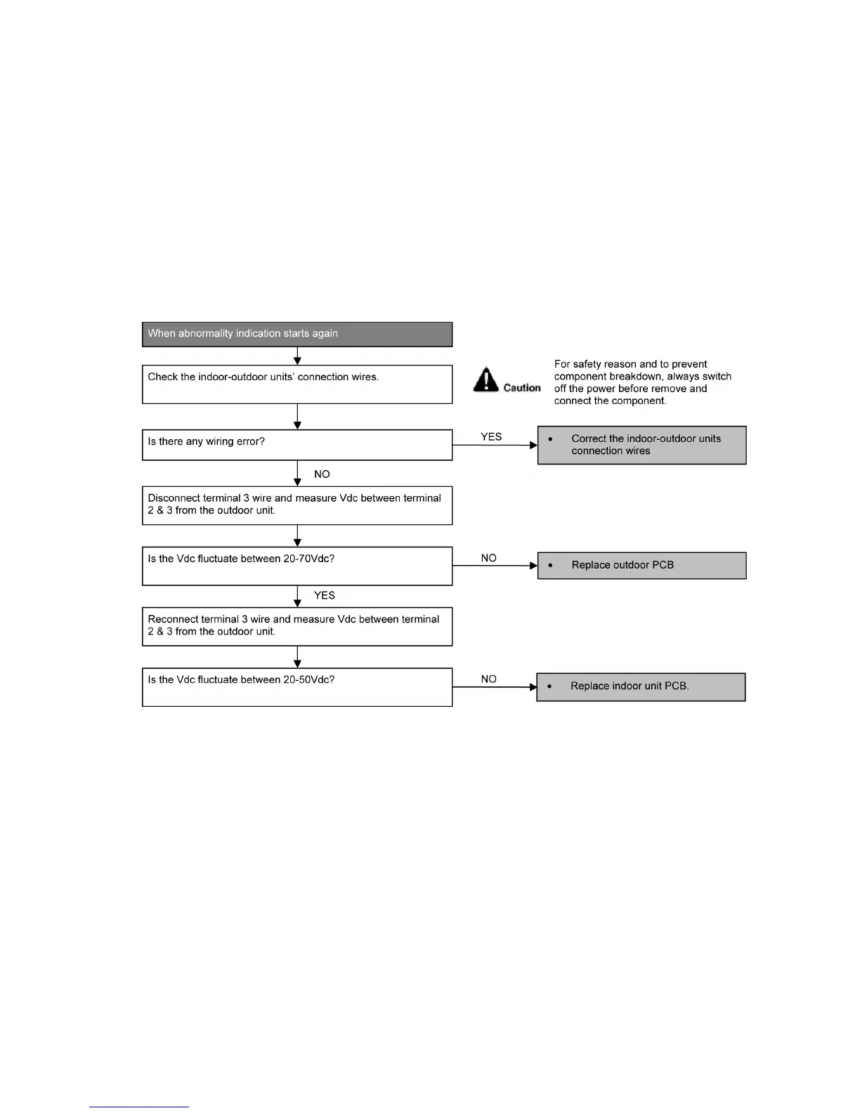 Indoor unit-outdoor unit signal transmission error due to wrong wiring.