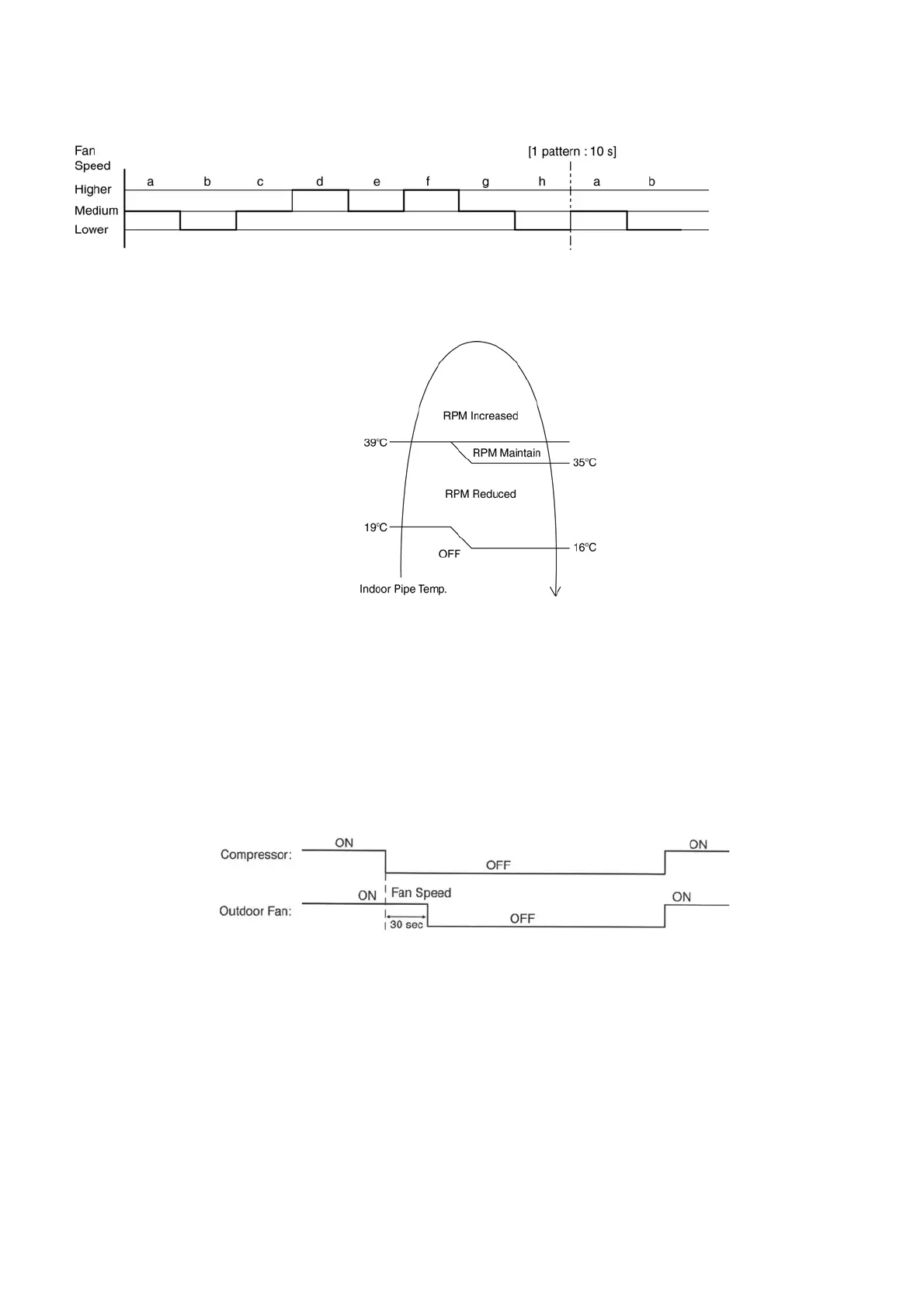 Outdoor fan motor is operated with one fan speed only. It starts when compressor starts operation and it stops 30