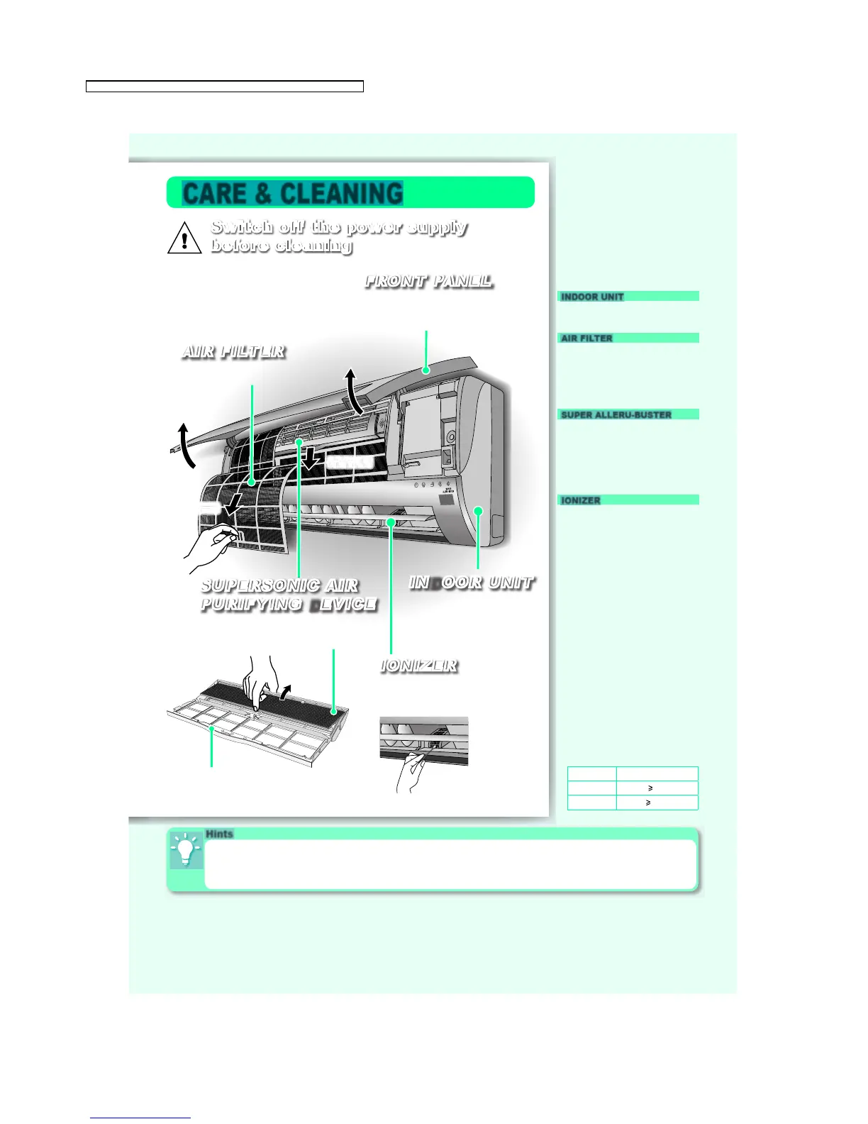 Clean the fi lter regularly as dirty fi lters will cause unpurifi ed air, low cooling or heating capacity, unpleasant smells and higher