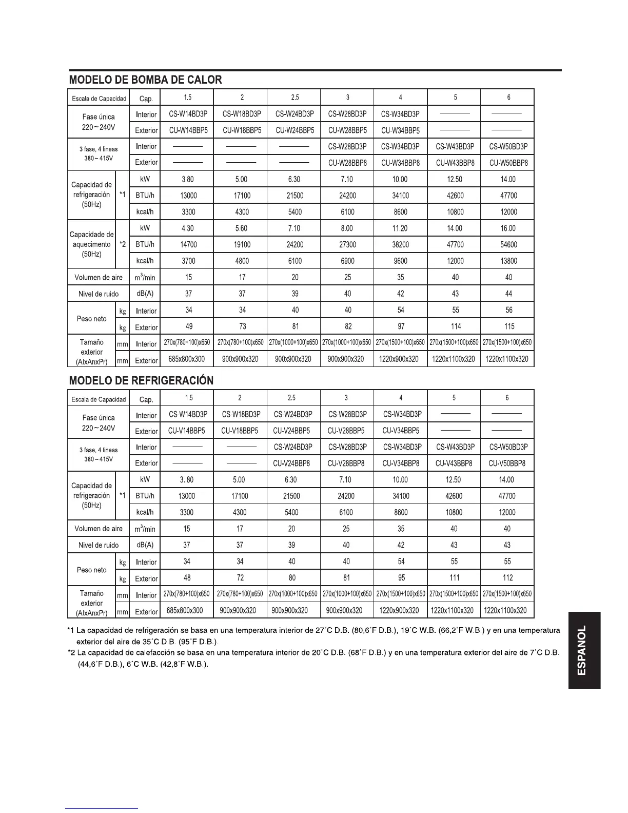 *2 La capacidad de calefacció n se basa en una temperatura interior de 20°C D.B. (68°F D.B.) y en una temperatura exterior del aire de 7°C D.B.