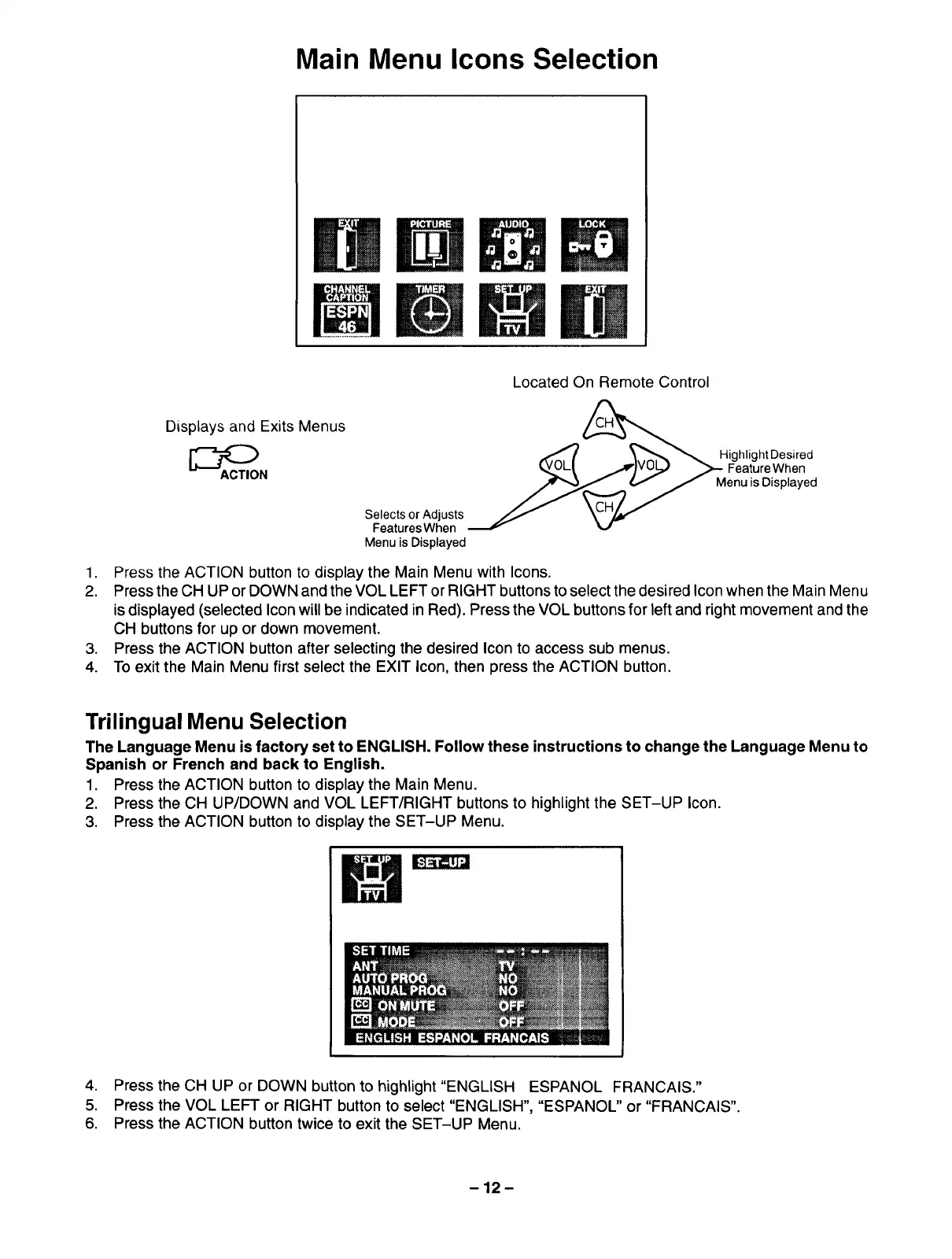 2. Press the CH UP or DOWN and the VOL LEFT or RIGHT buttons to select the desired Icon when the Main Menu