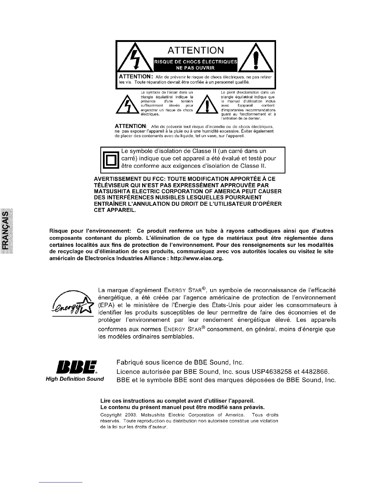 Copyright 2003. Matsushita Electric Corporation of America. Tous droits