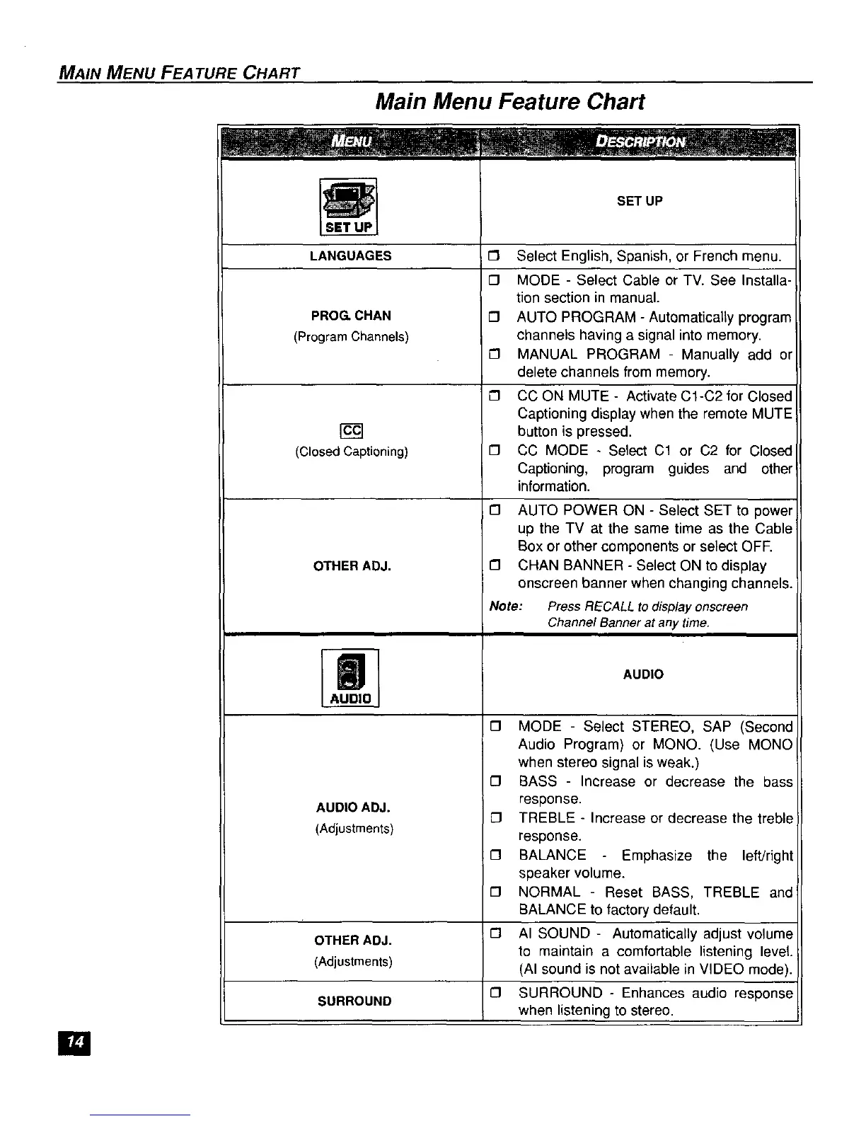 Main Menu Feature Chart