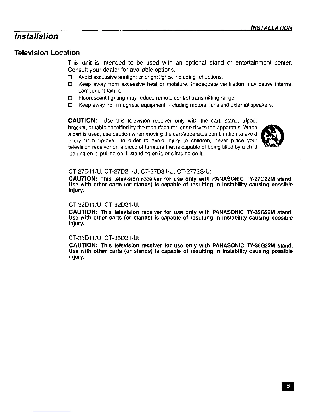 CAUTION: This television receiver for use only with PANASONIC TY-36G22M stand.