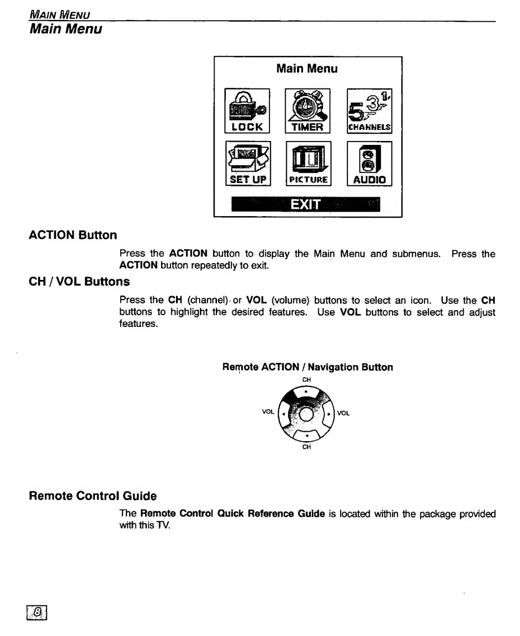 Panasonic CT-27D20 - Main Menu.8; ACTION Button.8; Remote Control Guide.8