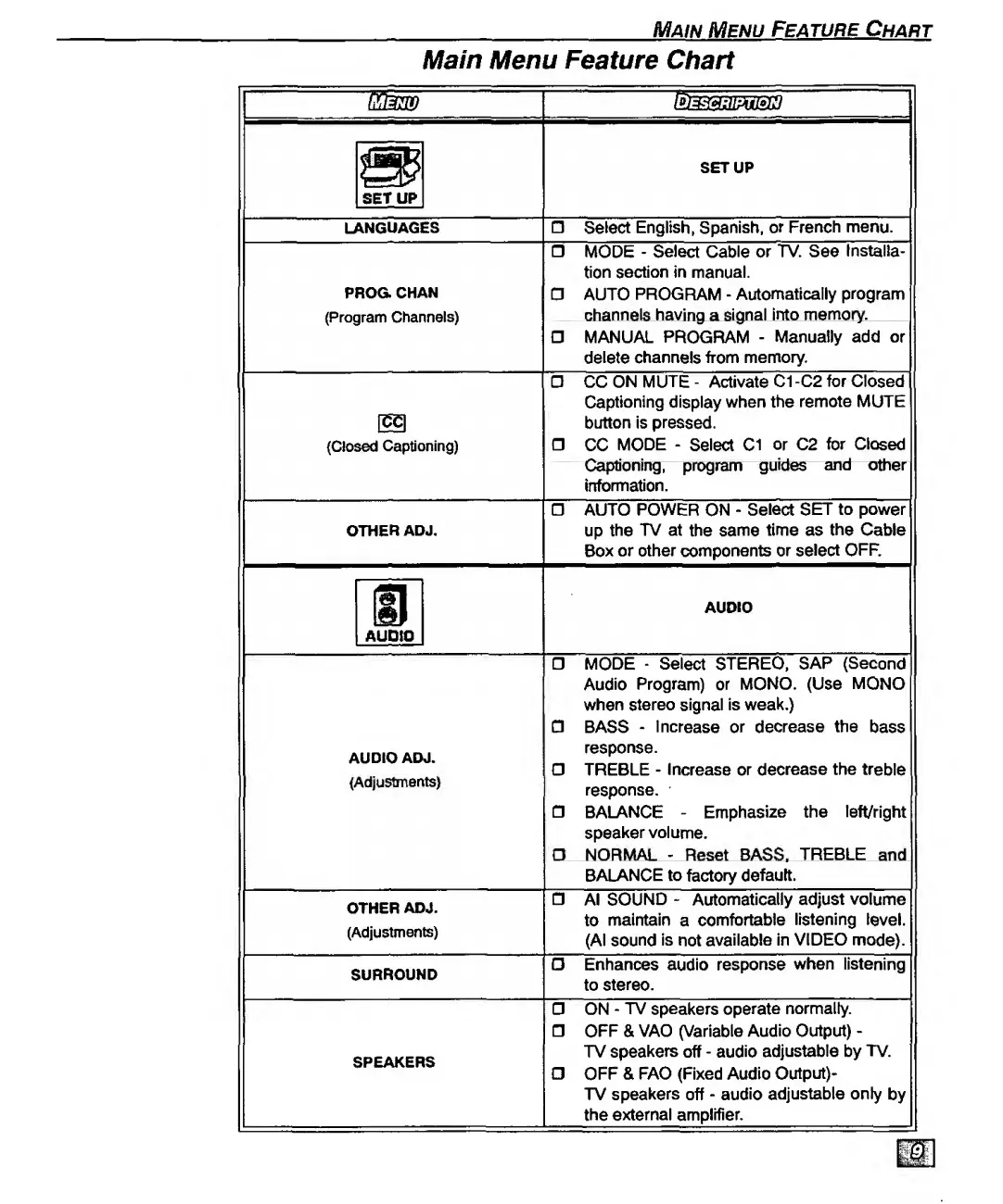 Panasonic CT-27D20 - Main Menu Feature Chart.9