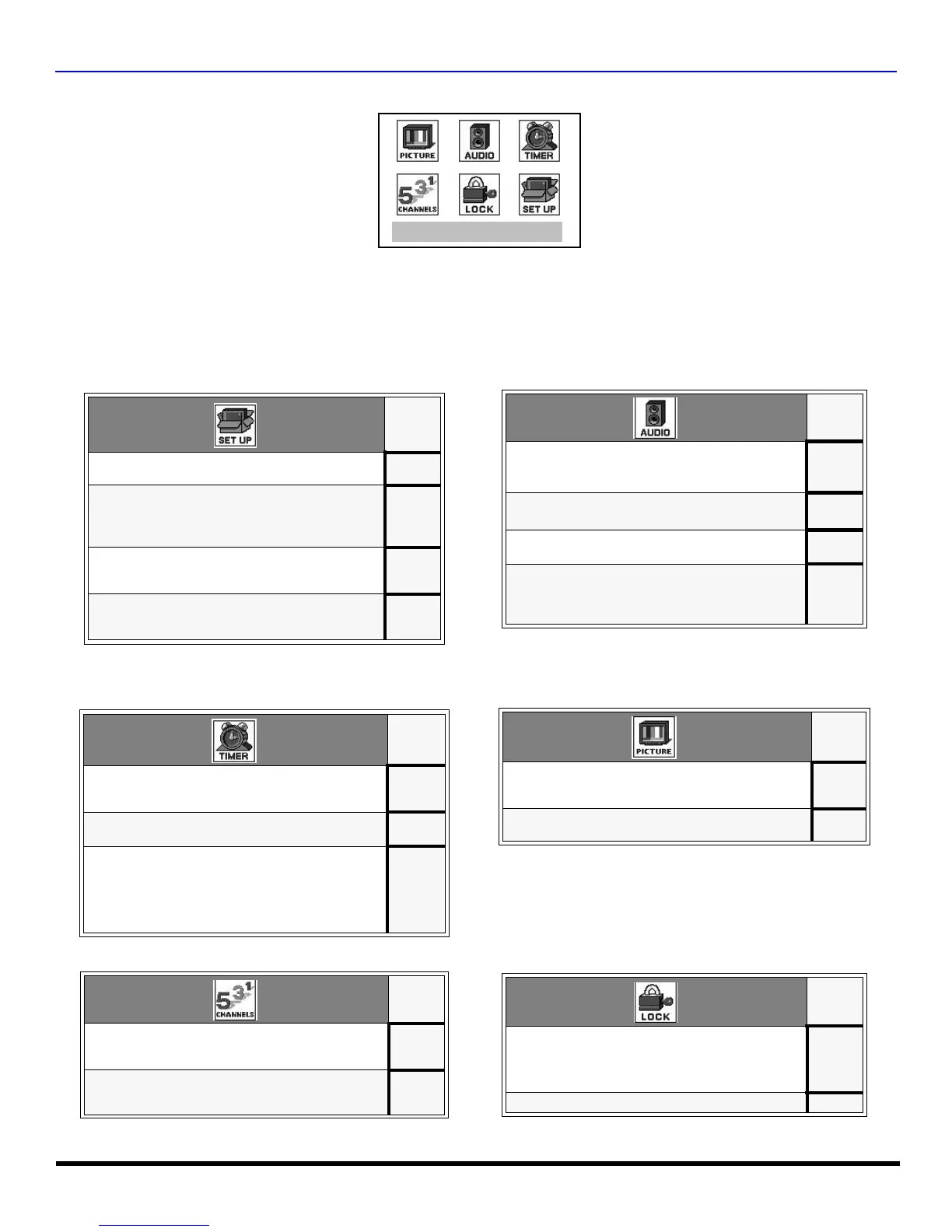 Estas tablas muestran todos los menús de cada icono y a que páginas ir para sus descripciones.