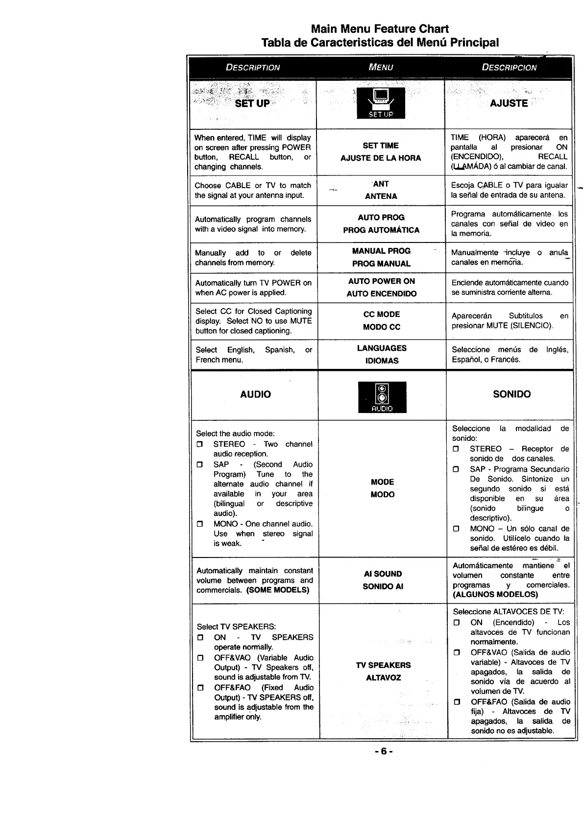 Main Menu Feature Chart