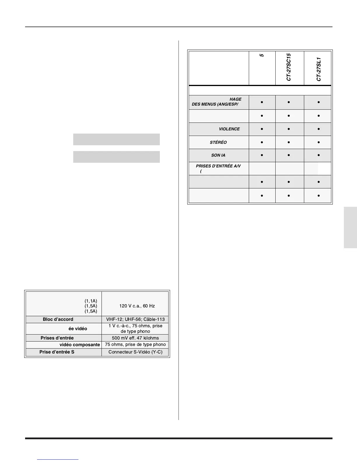 Table des caractéristiques