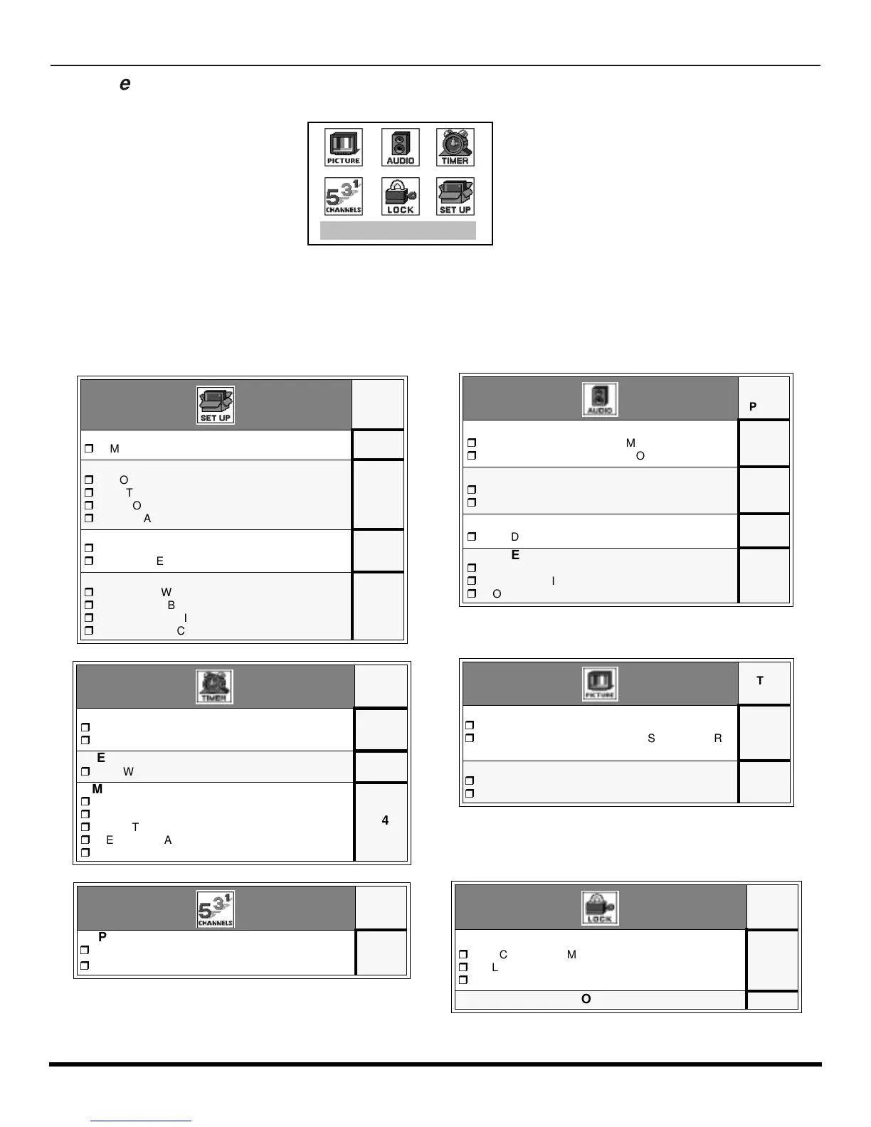 These charts list all menus under each Icon and which pages to refer to for menus description.