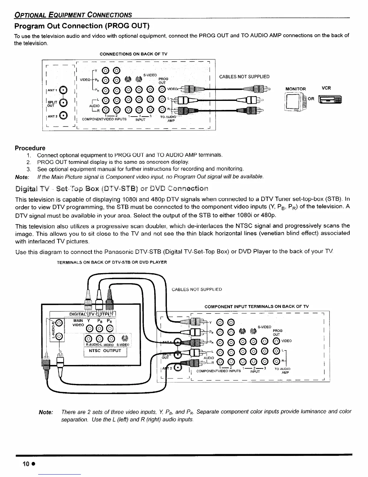 order to view DTV programming, the STB must be connected to the component video inputs (V, P,, PR) of the television. A