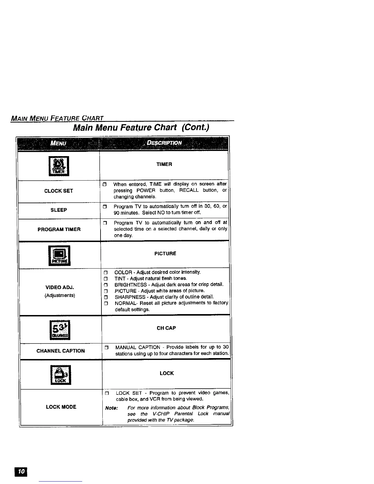Main Menu Feature Chart (ConL)