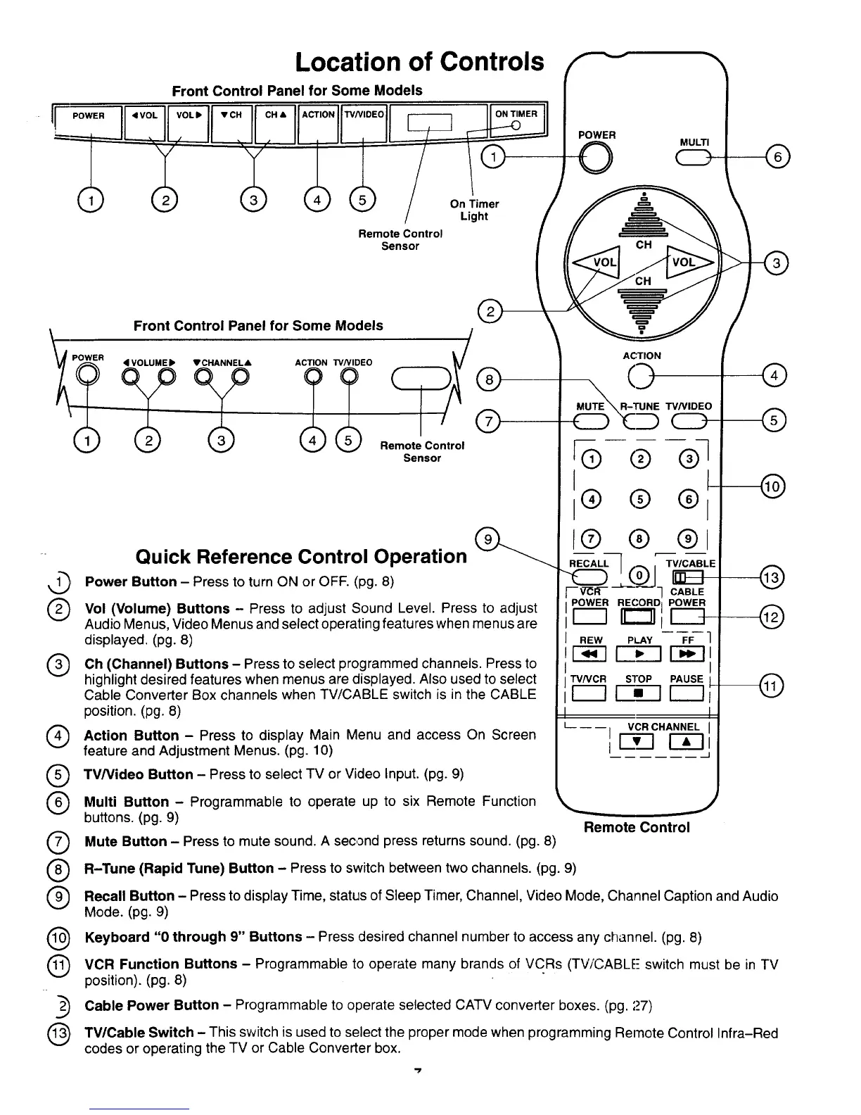 TV/Video Button - Press to select TV or Video Input. (pg. 9)