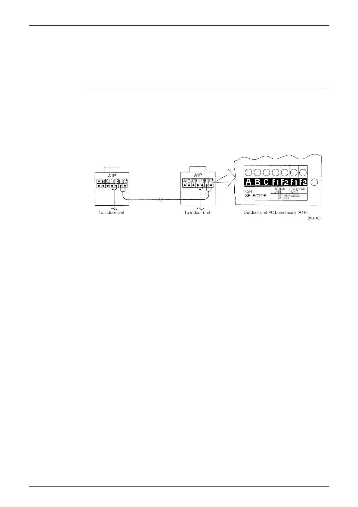 Connect transmission wiring to terminals F1 and F2 (outdoor - outdoor) on the outdoor unit PC board