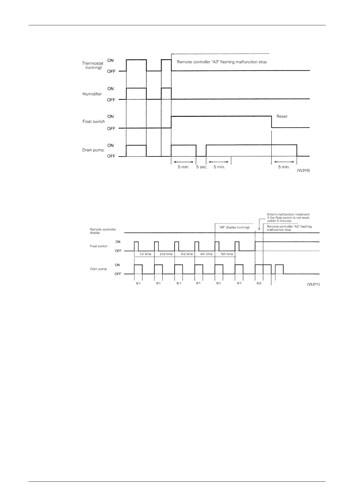 During heating operation, if the float switch is not reset even after the 5 minutes operation, 5 seconds stop,