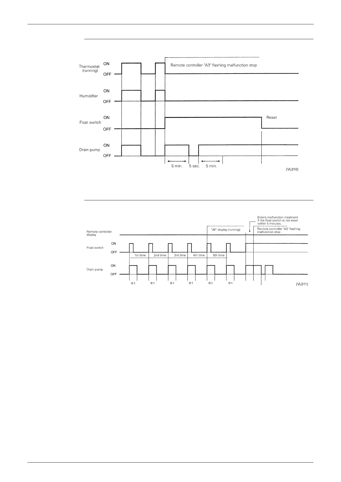 During heating operation, if the float switch is not reset even after the 5 minutes operation, 5 seconds stop,