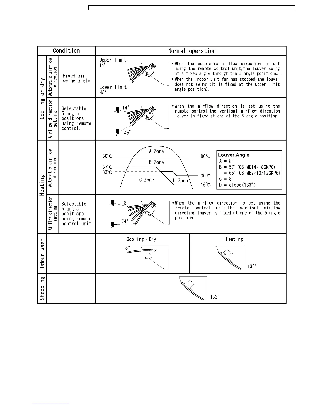 The vertical airflow direction louver is controlled as shown in the table below in response to the operation of the remote control air