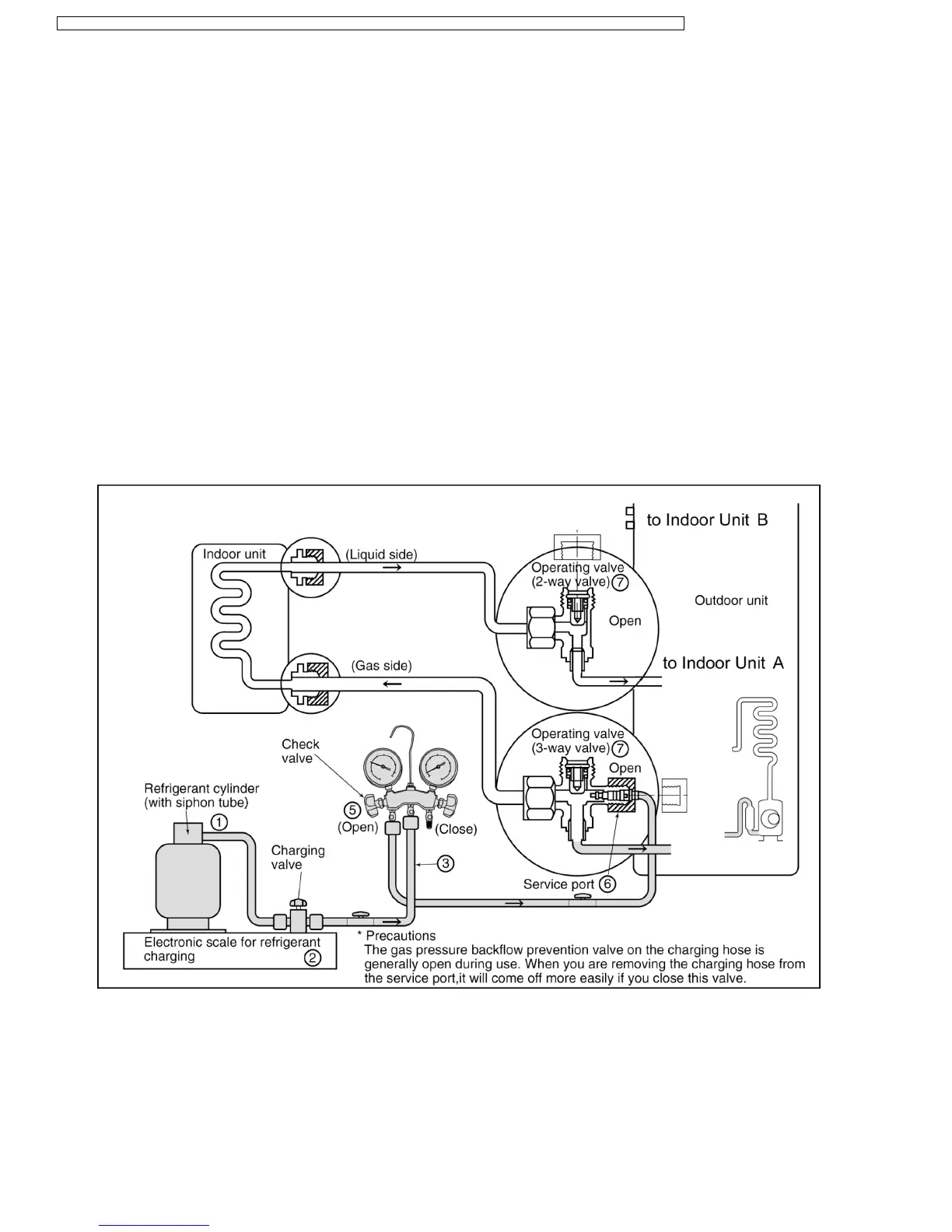 Never use the gas side to allow a larger amount of liquid refrigerant to be charged while operating the unit.