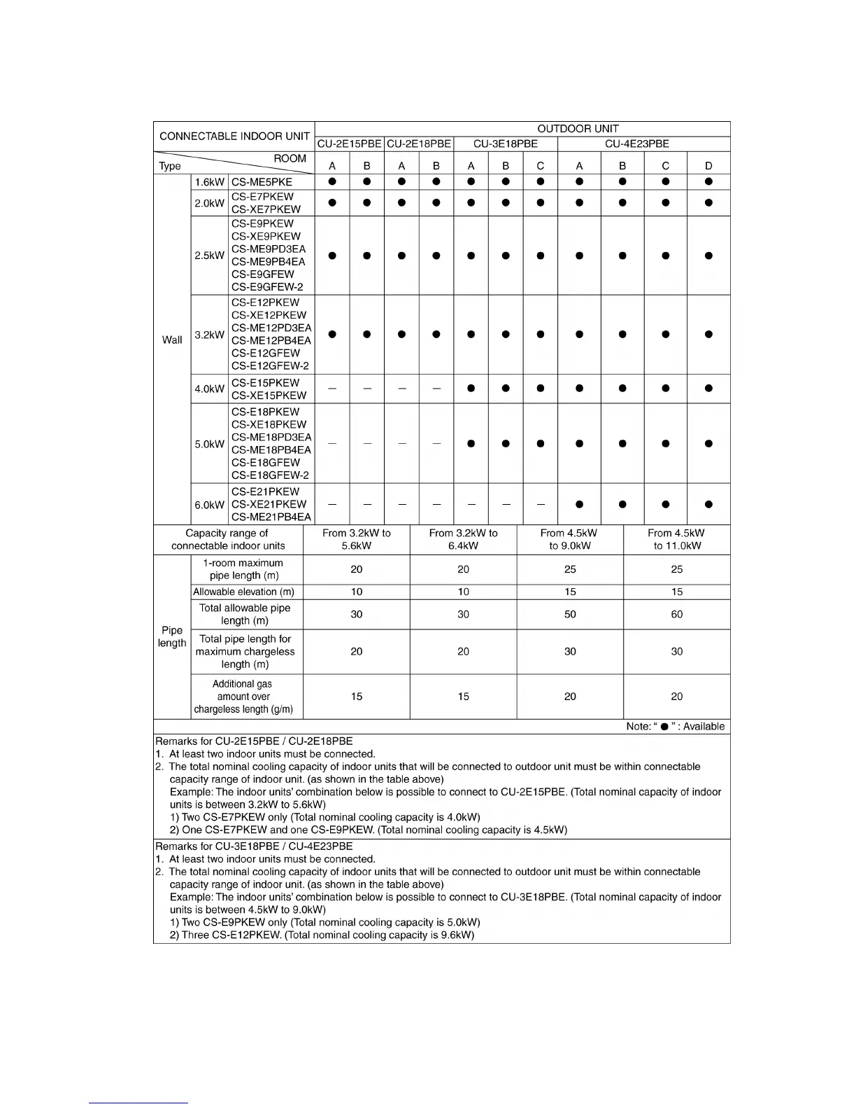 o A single outdoor unit enables air conditioning of up to two separate rooms for CU-2E15PBE, CU-2E18PBE.