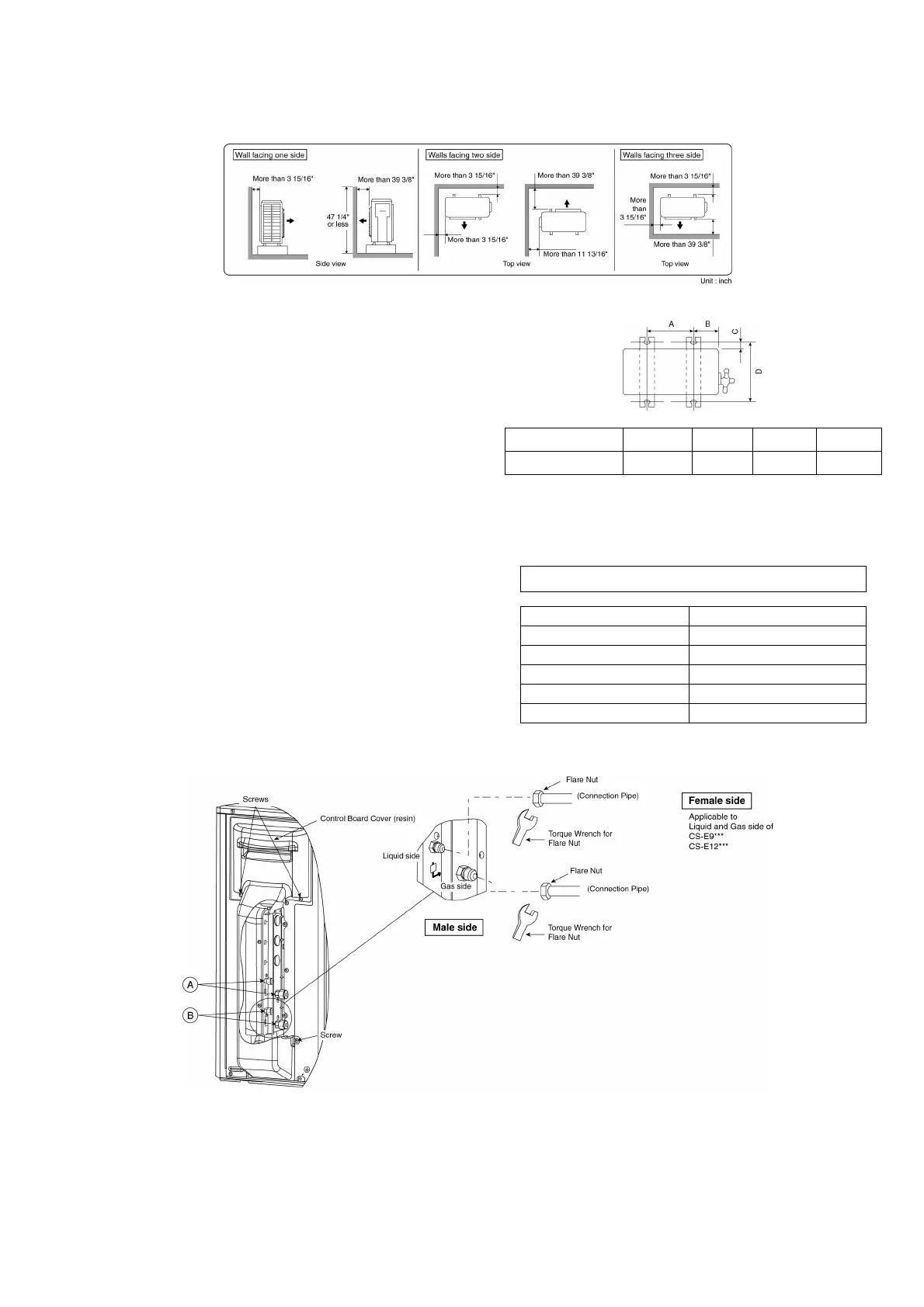 For any of the below installation patterns, the wall height on the exhaust side should be 47-1/4" or less.