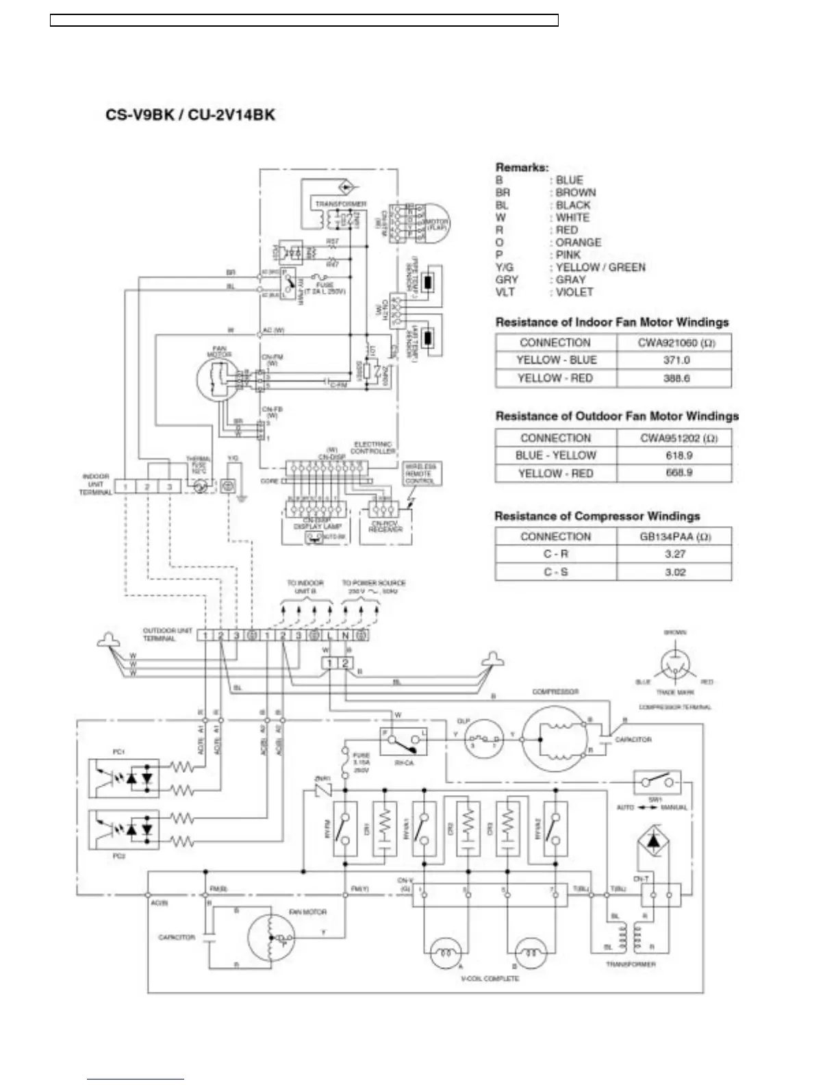 Panasonic CU-3V20BKP5G - Wiring Diagrams and Resistance Data