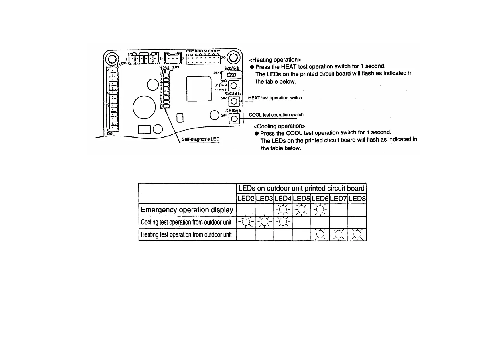 During outdoor unit emergency operation or test operation, the LEDs on the printed circuit board will flash.