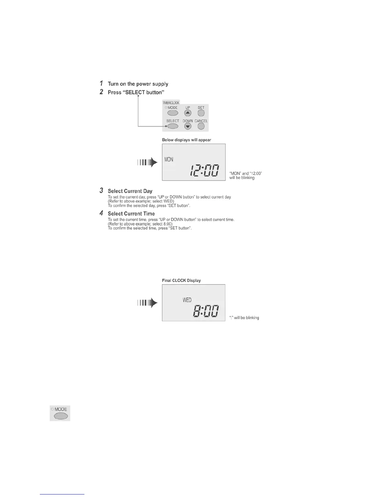 • If the “UP or DOWN button” is not pressed for 30 seconds during the day or time setting or if the “SELECT button” is pressed, the