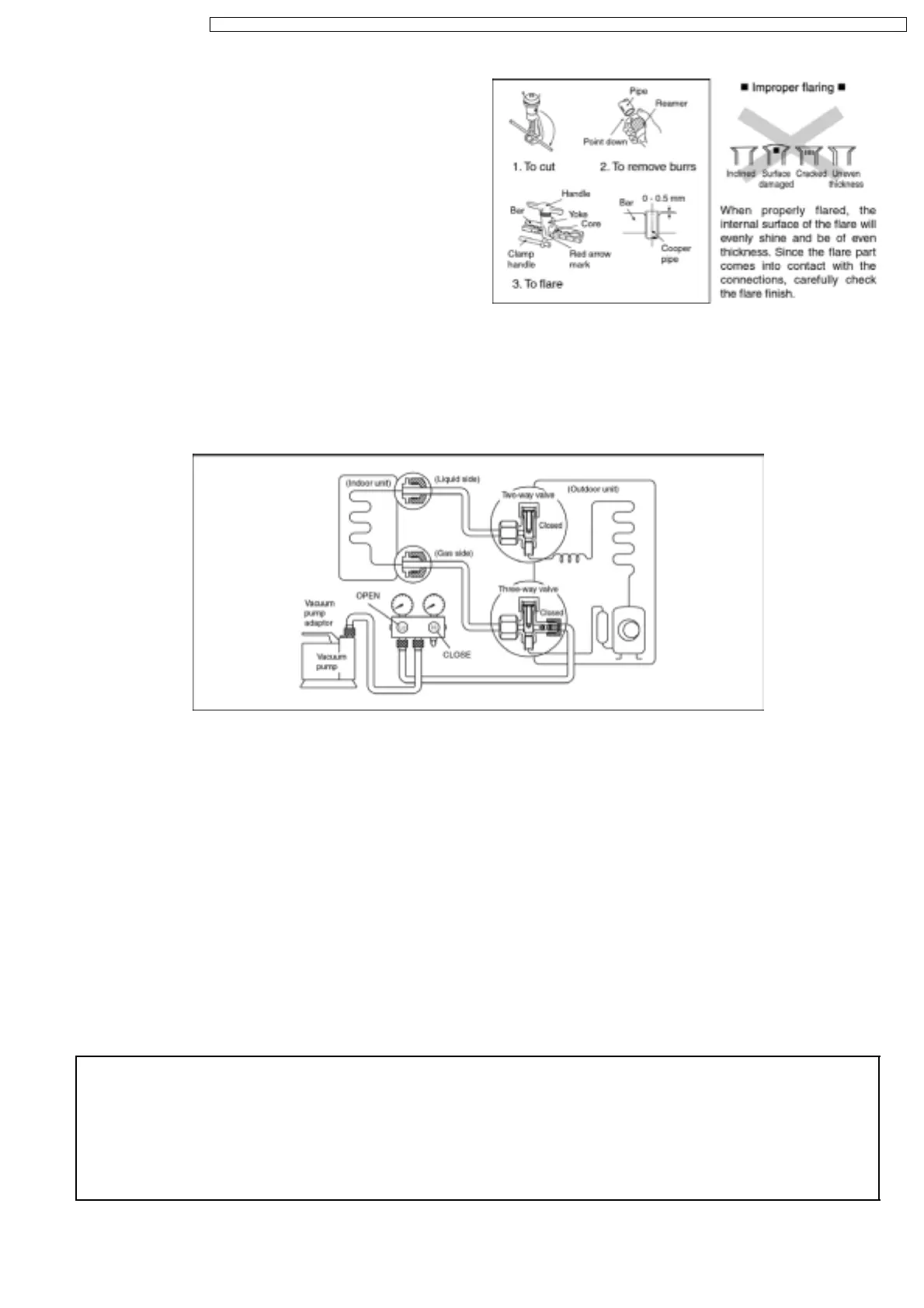 WHEN INSTALLING AN AIR CONDITIONER, BE SURE TO EVACUATE THE AIR INSIDE THE INDOOR UNIT AND PIPES in the