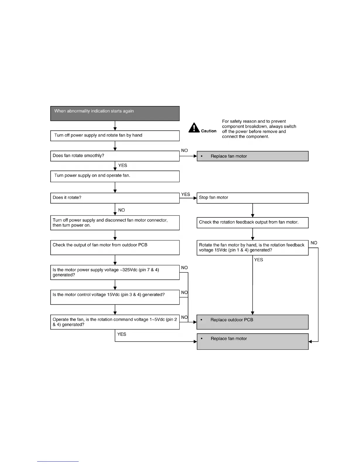 Operation stops due to short circuit inside the fan motor winding.