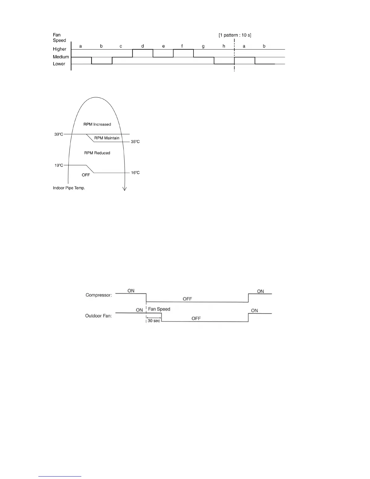 Outdoor fan motor is operated with one fan speed only. It starts when compressor starts operation and it stops 30