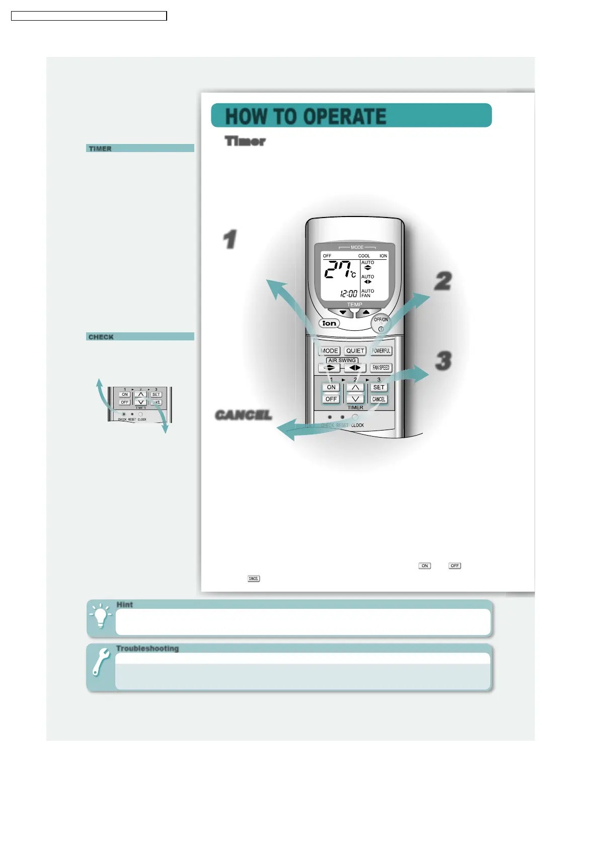 For your convenience, you could set the air conditioner to operate automatically by using both ON and OFF timer.