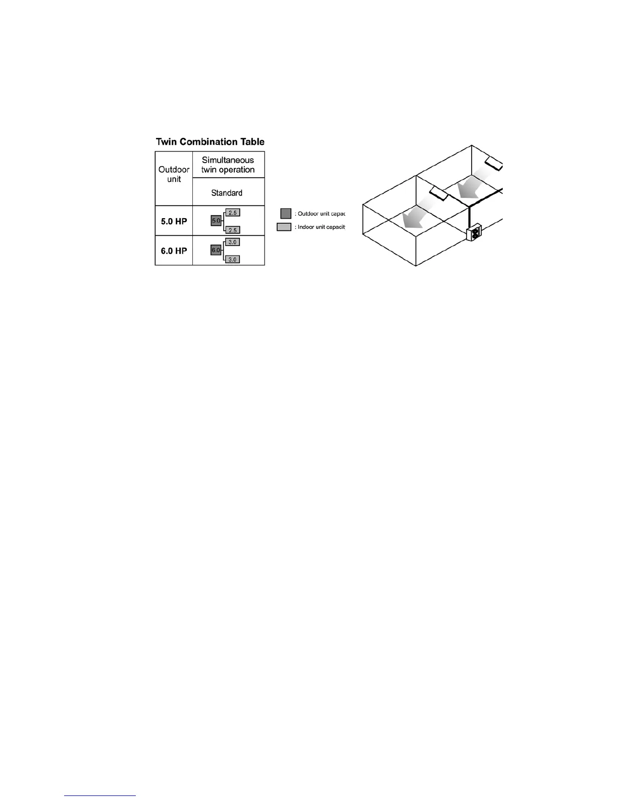 Simultaneous air conditioning of wide spaces and corners is possible. Indoor units with same horsepowers can be used in
