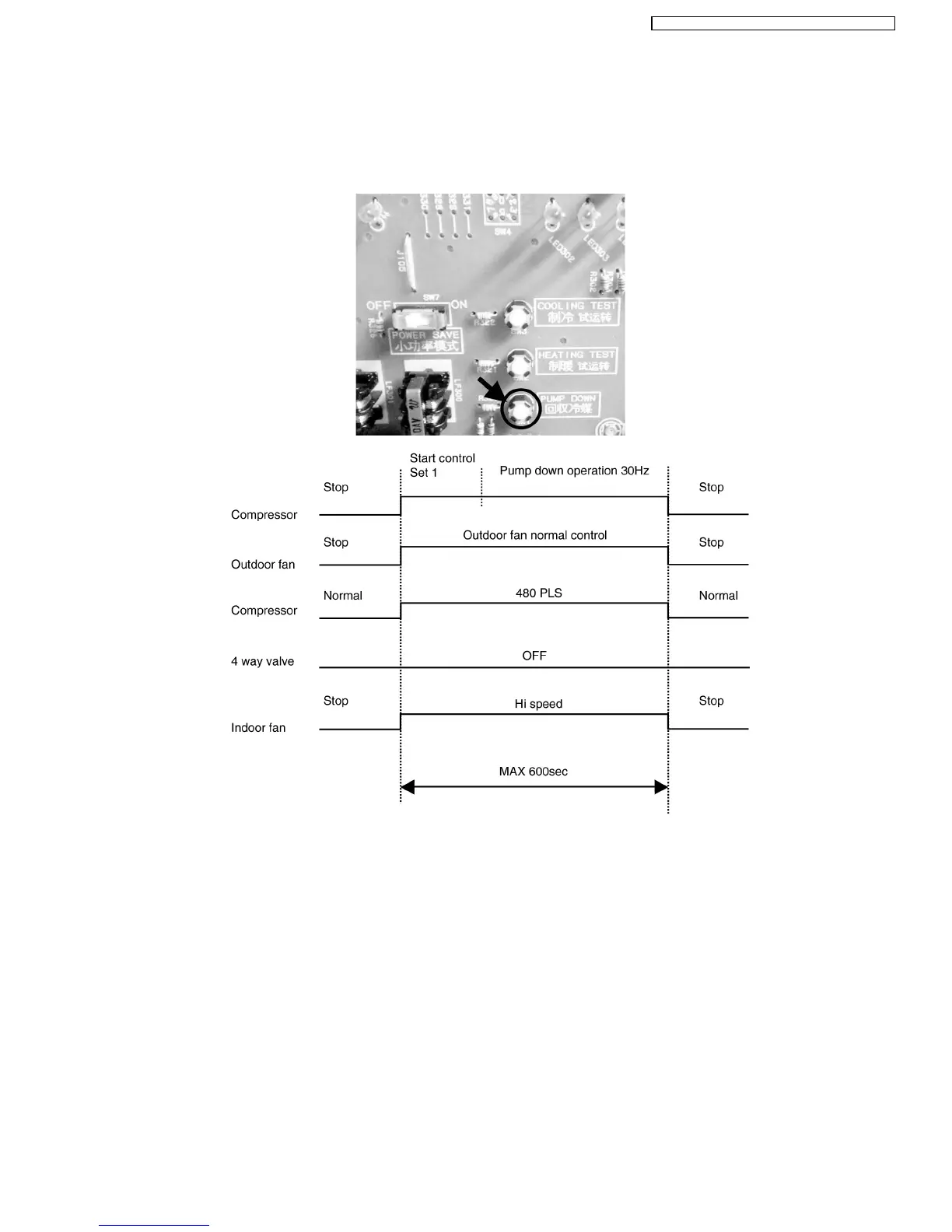 When pushing the [PUMP DOWN] button on the outdoor PCB for 1 second, pump down operation start. Detail of pump down