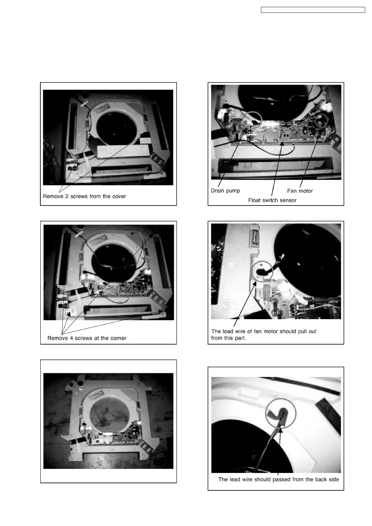 6. When install back drain pan, make sure the lead wire of fan