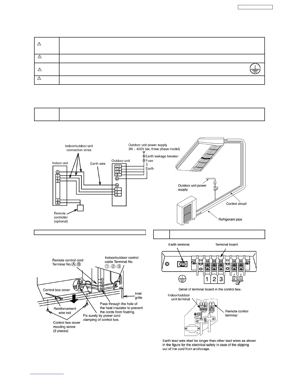 Caution Be sure to install a current leakage breaker, main switch and fuse to the main power supply, otherwise electric shocks may