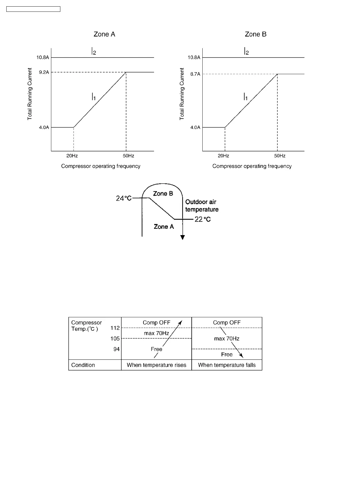 When the temperature of compressor rises to 105°C, the frequency is reduced as shown in diagram below. When the