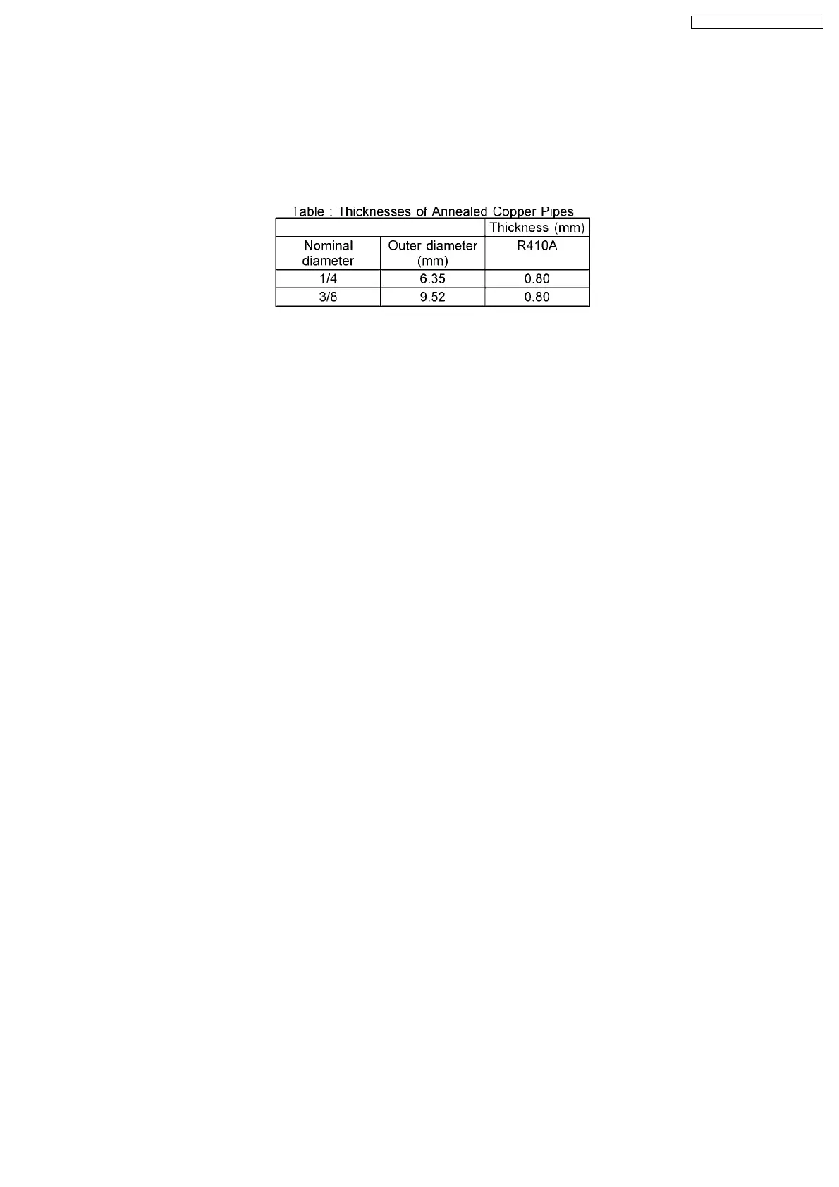Thicknesses of copper pipes used with R410A are as shown in Table. Never use copper pipes thinner than 0.8mm.