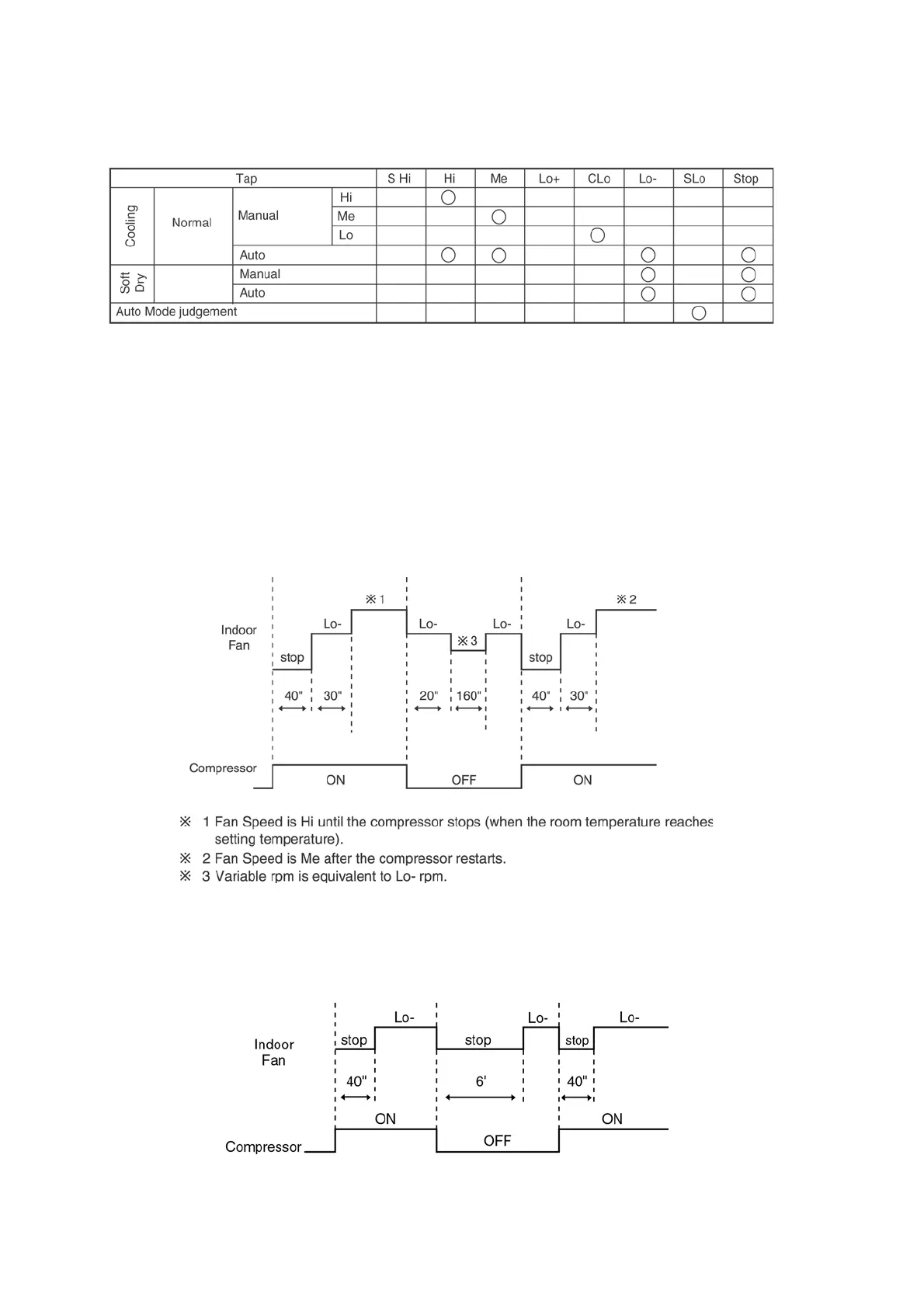 4. During compressor stop, indoor fan will operate at Lo for the beginning 3 minutes to prevent higher volume of refrigerant in