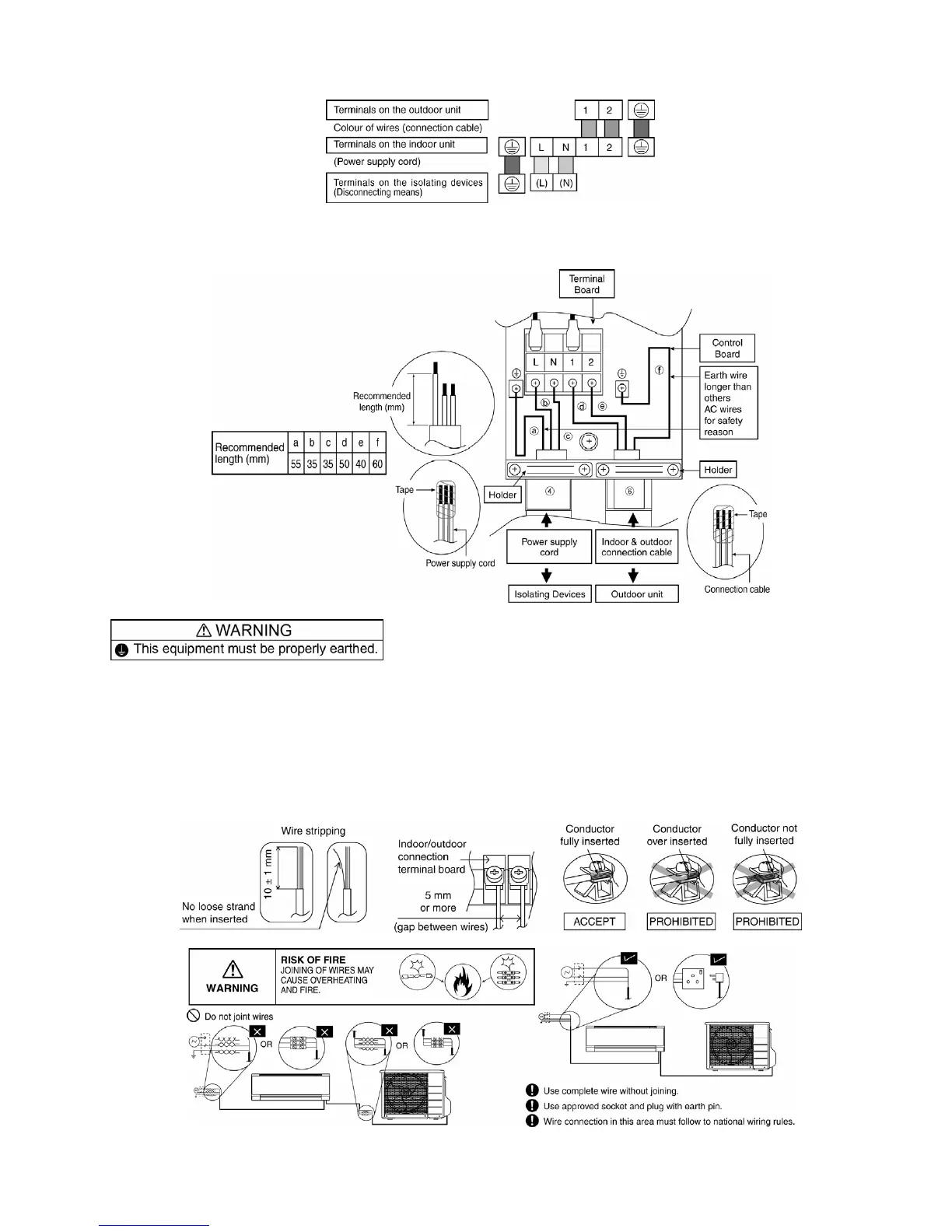 Ensure the colour of wires of outdoor unit and the terminal Nos. are the same to the indoor’s respectively.