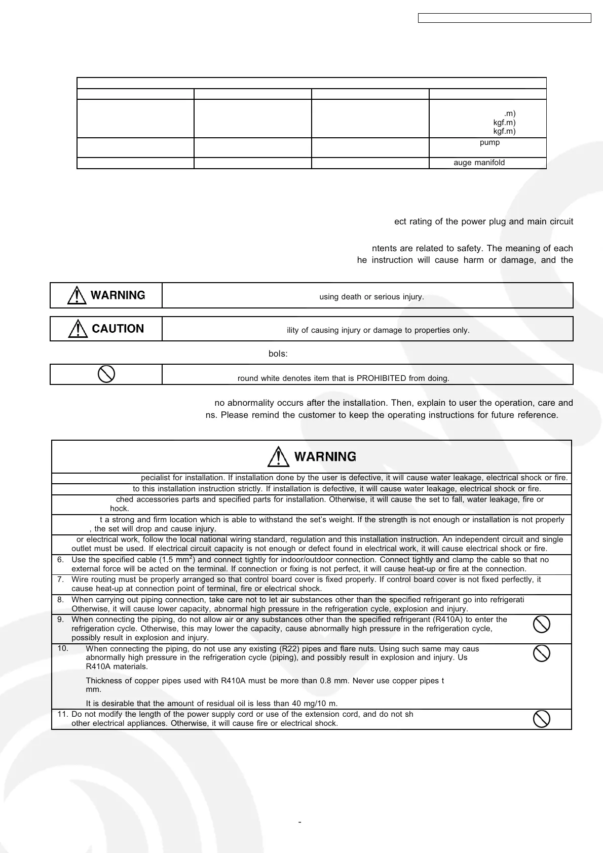 1. Engage dealer or specialist for installation. If installation done by the user is defective, it will cause water leakage, electrical shock or fire.