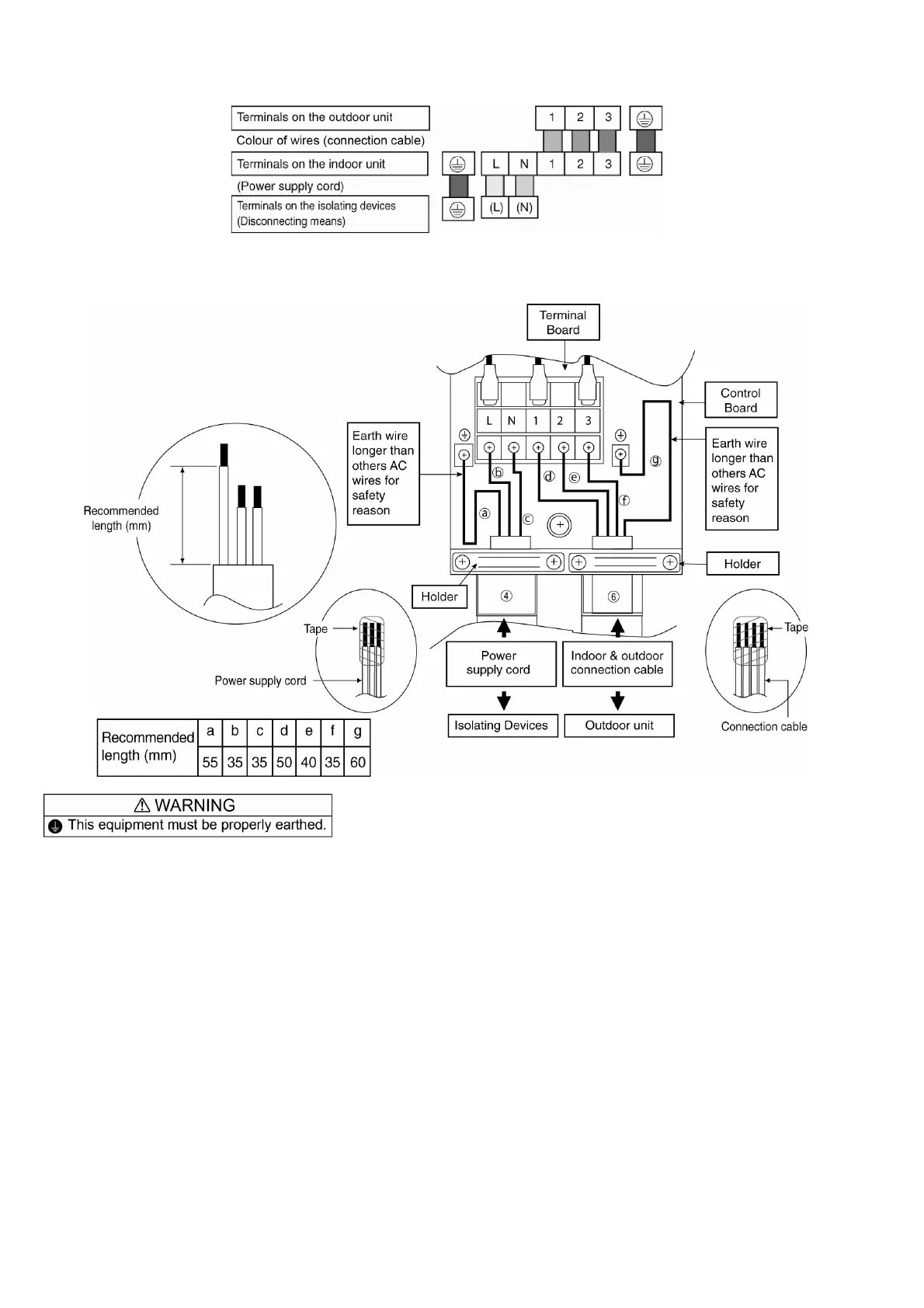 Ensure the colour of wires of outdoor unit and the terminal Nos. are the same to the indoor’s respectively.