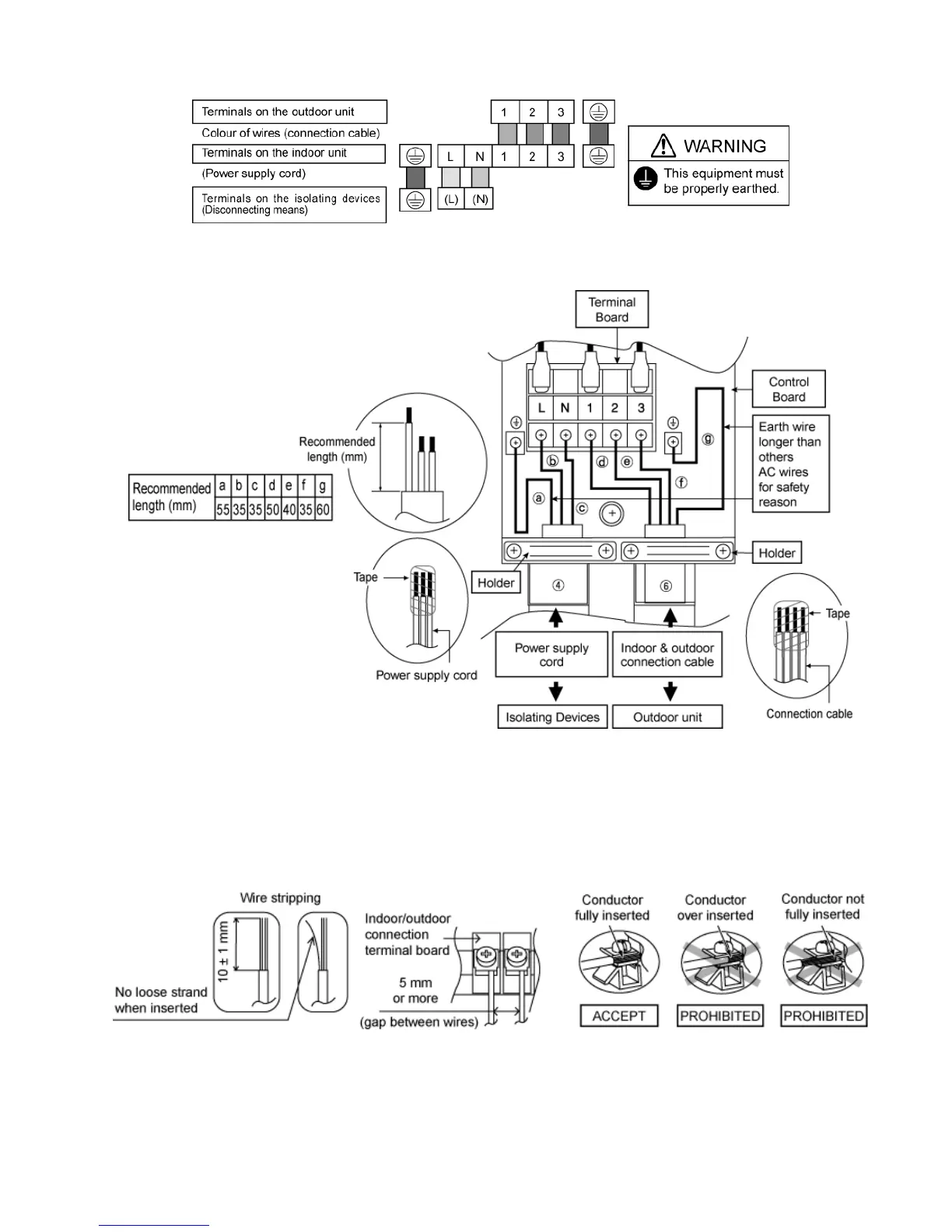 • Ensure the colour of wires of outdoor unit and the terminal Nos. are the same to the indoor’s respectively.