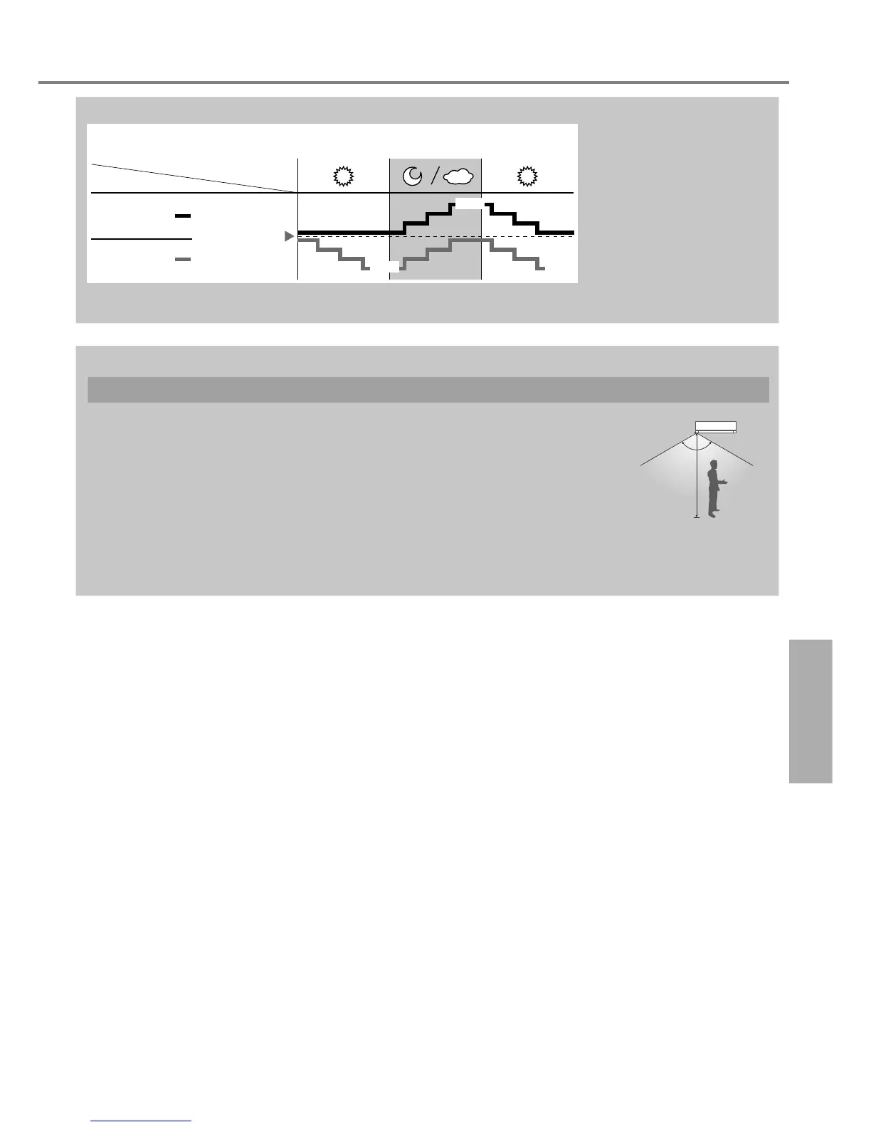 • In fensterlosen Räumen bzw. in Räumen mit dicken Vorhängen wird der Sonnenlichtsensor von starker Bewölkung